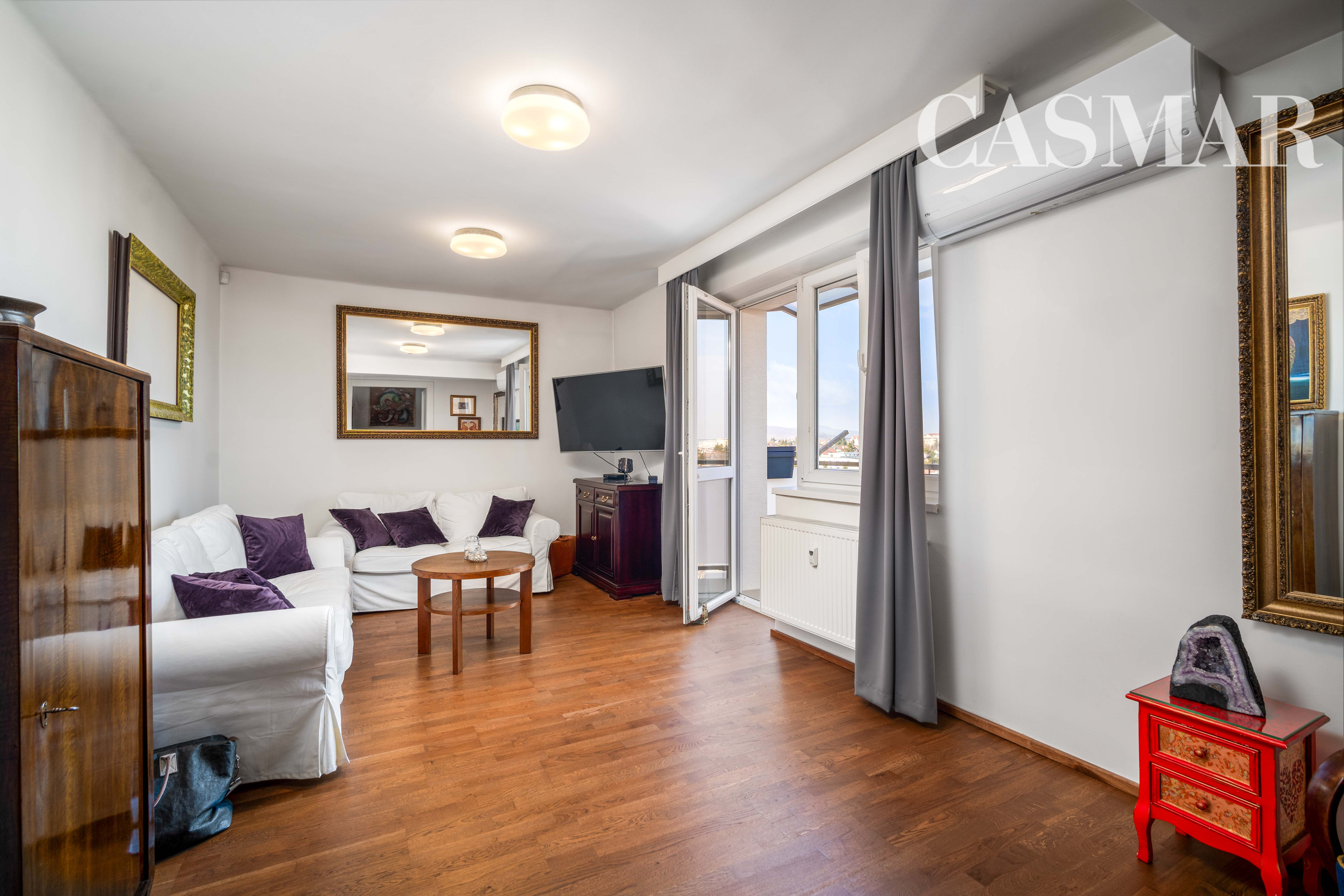 Byt prešiel kompletnou rekonštrukciou: drevené parkety, bezpečnostné dvere Sherlock, nové stierky a maľovka, nové rozvody el., nová sanita villeroy boch, alarm v byte aj v pivnici, intérierové dvere, plastové okná, nová kuchynská linka so zabudovanými spotrebičmi siemens A+, klimatizácia, vlastny elektrický kotol.